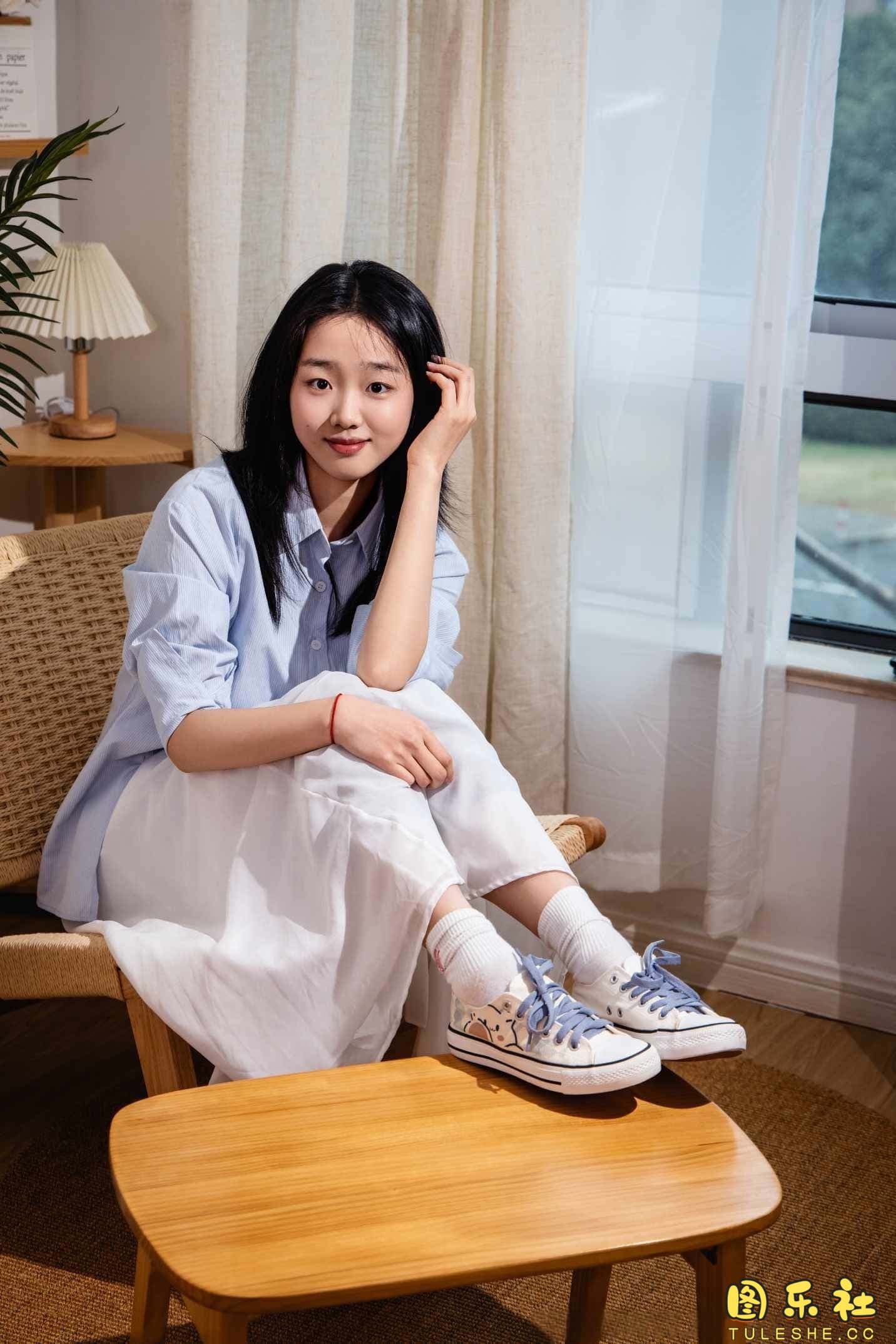 搭配:蓝色衬衫、白色长裙、帆布鞋、白色棉袜、裸足